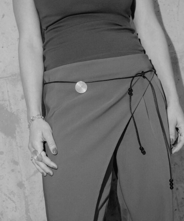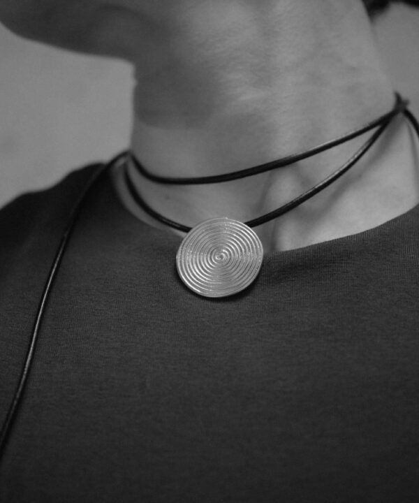 Uzumaki es un disco audaz, adornado con una hipnótica espiral en gran escala: una pieza de impacto, un amuleto. Cuelga de una tira de cuero decorada con esferas de ónix, lo que permite llevarlo de múltiples formas: como collar o incluso como cinturón. Su nombre “espiral” en japonés, es una figura que representa los ciclos, el fluir y lo infinito. El movimiento continuo de la vida.