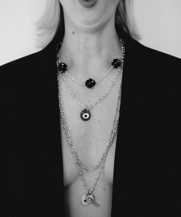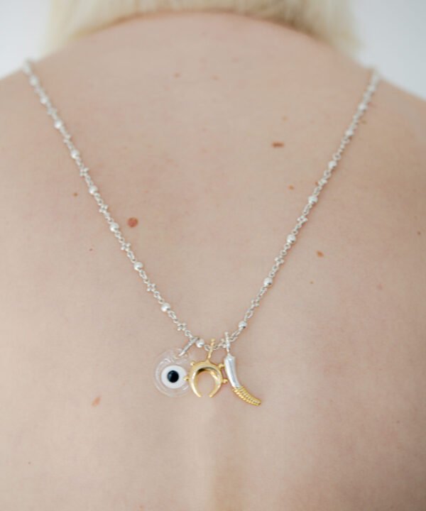 Un delicado dije de vidrio inspirado en el tradicional Nazar turco, que presenta el icónico símbolo del ojo, conocido por alejar las energías negativas y atraer la protección. Esta pieza atemporal es un poderoso talismán para acompañarte día a día.