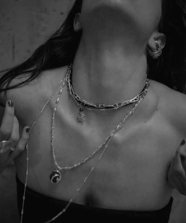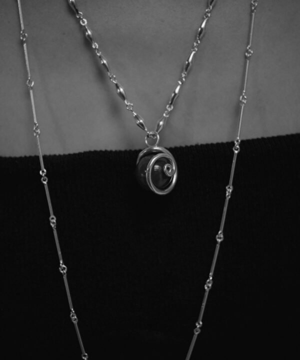 Lleno de simbología, el dije Ummu – la fuente femenina de creación. En su núcleo, una gran esfera de ónix fluye con movimiento, encarnando la fuerza y la continuidad de la espiral. El ónix como piedra de protección y arraigo, protege de la negatividad, potencia el enfoque y la resiliencia.