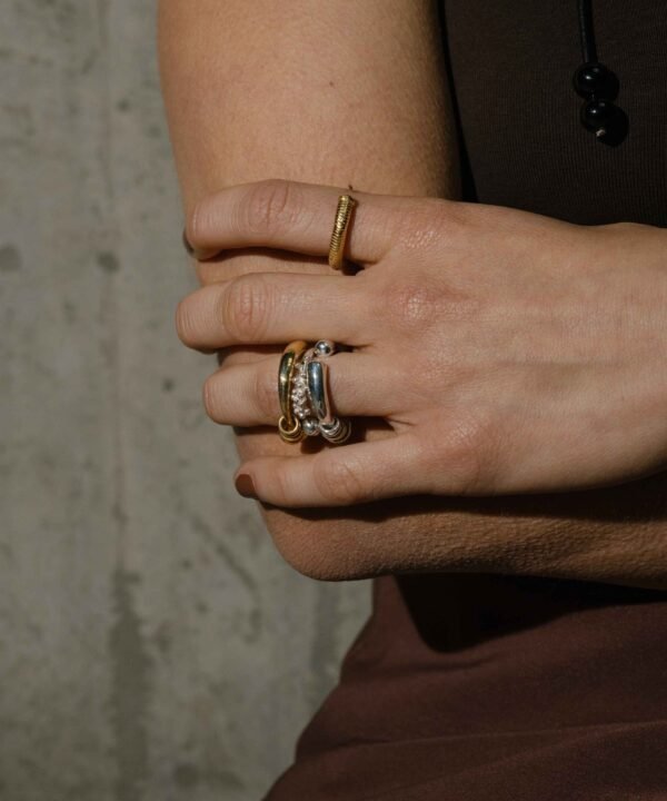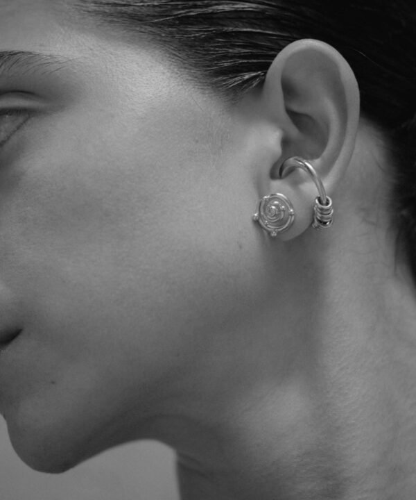 Kundali, una pieza versátil que se transforma de ear cuff a anillo. De su estructura cuelgan delicados aros que se mueven con libertad, invitándote a jugar con su dinamismo y adaptarla a tu estilo. Su diseño evoca la energía vital Kundalini que fluye y asciende en espirales.