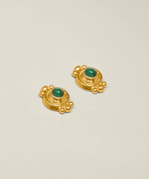 The Karu Studs are elegant, small studs that resemble eyes, featuring a delicate stone at the center and adorned with little spheres.