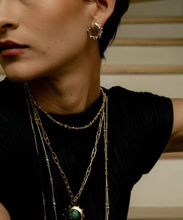 La cadena Ojo tiene eslabones en forma de ojos que aportan un toque distintivo a tu estilo, y que sirven como amuletos de protección. Disponible en tres tamaños, ideal para combinar y apilar.