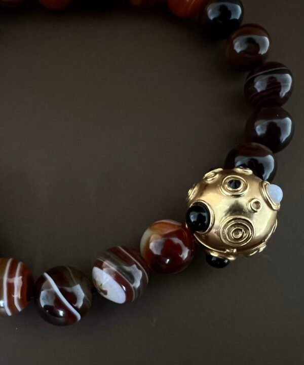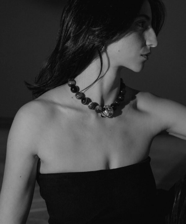 Churu, a bold necklace featuring large striped red agates striped, is centered by a sphere engraved with spirals and circles. It evokes circularity and fluidity, reminding us that everything is in constant motion. The stones convey this same essence: red agate for vitality, blue lace agate for calm, onyx for strength, and black zircon for depth.