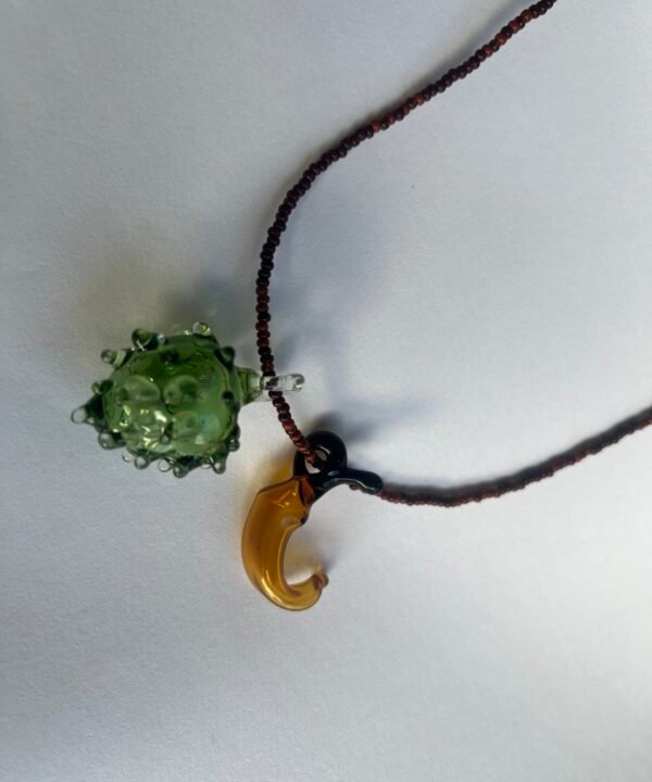 To complete the essentials, an amulet necklace. Designed to be worn around the neck or on the wrist, it combines two powerful symbols: the artichoke, an emblem of openness and transformation, and the chili, a protective guardian and bearer of vital energy.