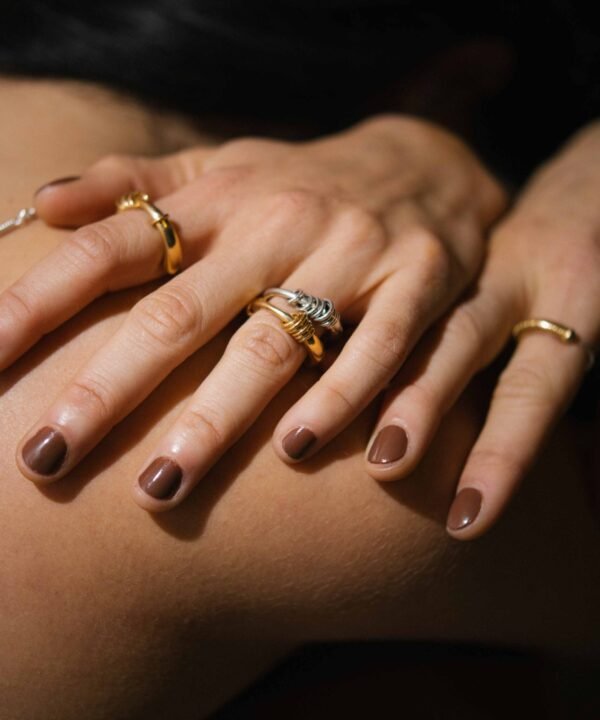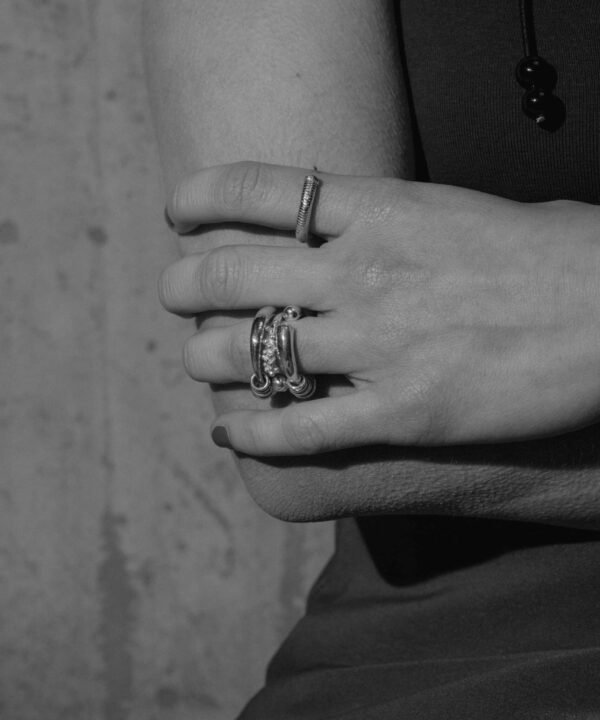 Kundali, a versatile piece that transforms from an ear cuff to a ring. Delicate hoops hang from its structure and move freely, inviting you to play with its dynamism and adapt it to your style. Its design evokes the vital Kundalini energy that flows and ascends in spirals.