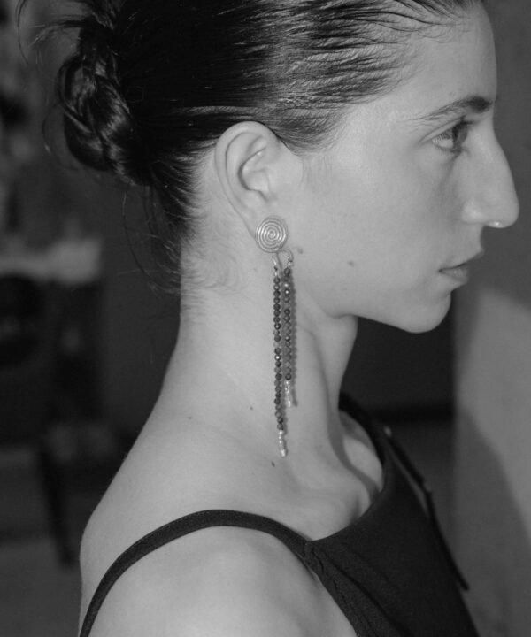 Inspired by the Ummu, a symbol of the feminine and creation, these spiral earrings feature flowing strands of faceted malachite that evoke movement and transformation. Lapis lazuli, with its intense deep blue flecked with golden sparkles, symbolizes wisdom, inner truth, and spiritual connection.