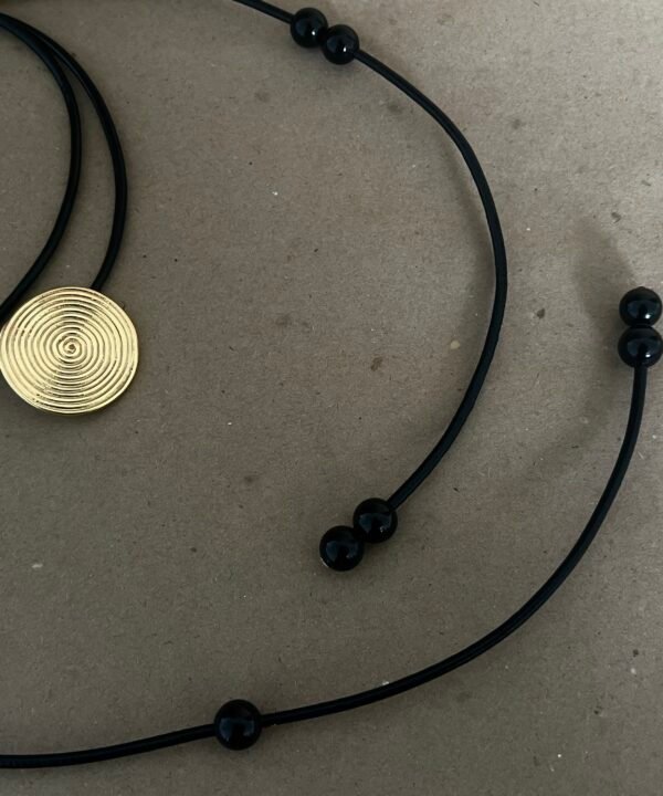 A bold disc with a hypnotic macro spiral — a true statement piece, an amulet. It hangs from a strand of leather decorated with onyx spheres that can be worn as a necklace in different ways as well as a belt. Its name, Uzumaki, means “spiral” in Japanese, a form that symbolizes cycles, flow, and infinity. In this design, the spiral becomes a reminder of transformation and the continuous movement of life.